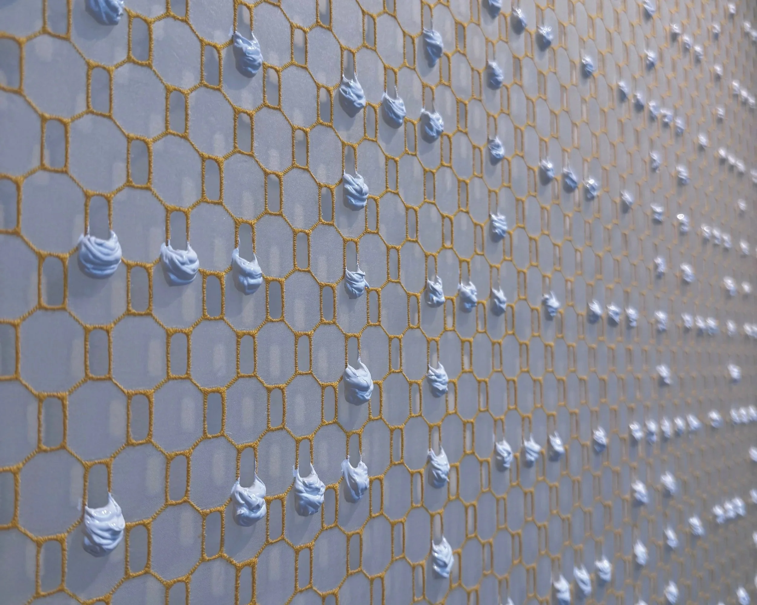 Peata Larkin, Silent Kōrero, 2026 (detail). Acrylic on embroidered silk, 1200mm x 1200mm. Image courtesy of the artist.