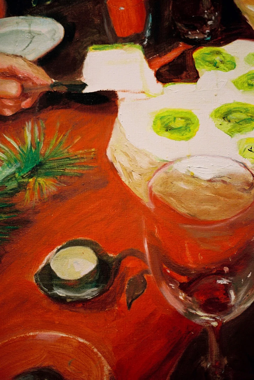 ‘who moved my cheese?’ and ‘girl, so confusing’ are part of a triptych painting series which refer to a Christmas dinner at a family gathering. These deeply personal works refer to my acceptance of the joys and discomforts of togetherness. ‘posture of confession’ holds a similar sentiment. The three paintings refer to elements of biblical communion, such as the The Last Supper and finding grace in the ordinary.