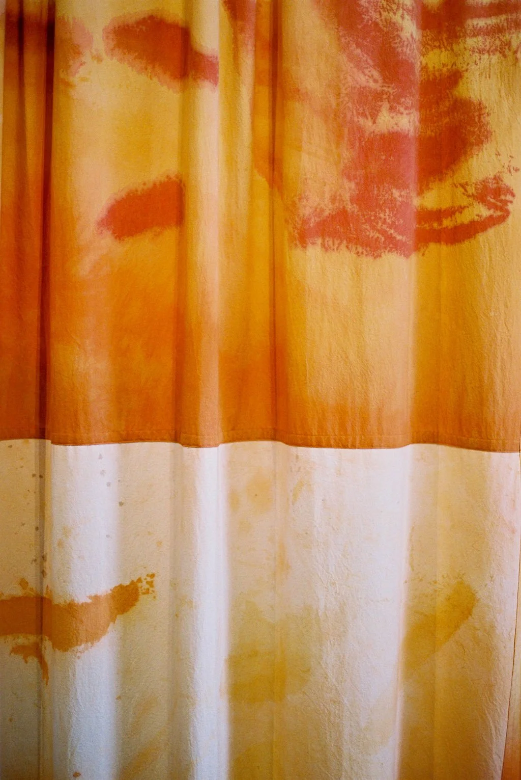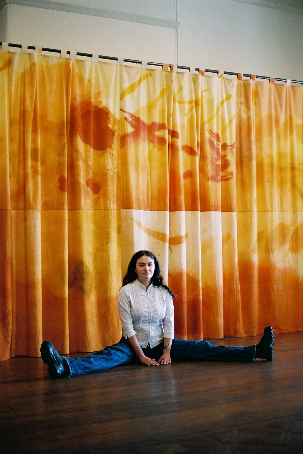 Parade was created during my time in the scallop room at the Whangārei Arts Quarry. I spent a lot of time at the quarry and at Whangārei Heads growing up. The panels were painted on the studio floor, which allowed me to directly document the physicality of the land underneath and the weight of my body above.